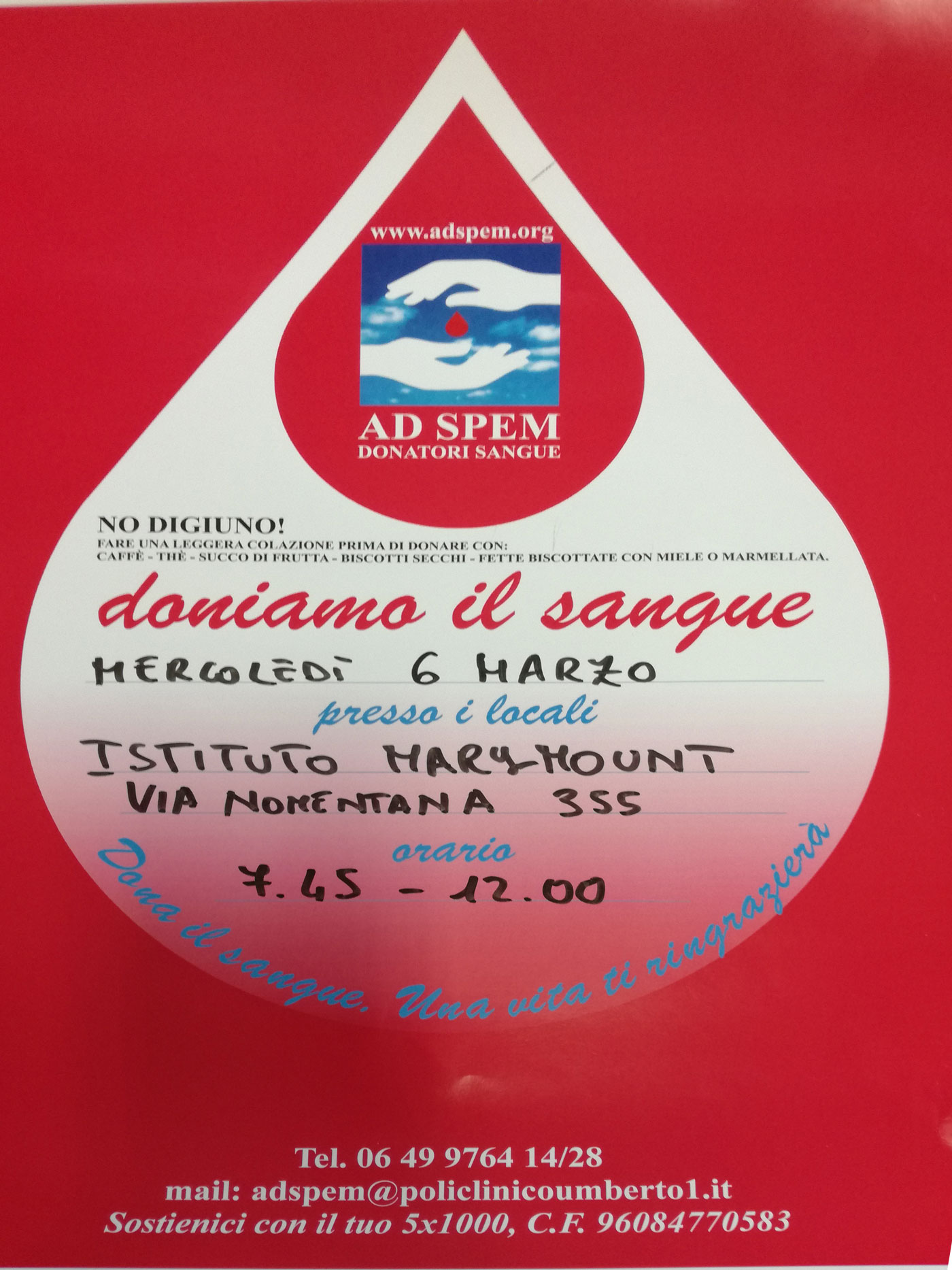 Domani, mercoledì 6 marzo – a partire dalle ore 7.45 alle ore 12.00 – il nostro Istituto ospiterà, nella sede di Via Nomentana 355, l’autoemoteca  AD SPEM per la giornata di donazione del sangue.