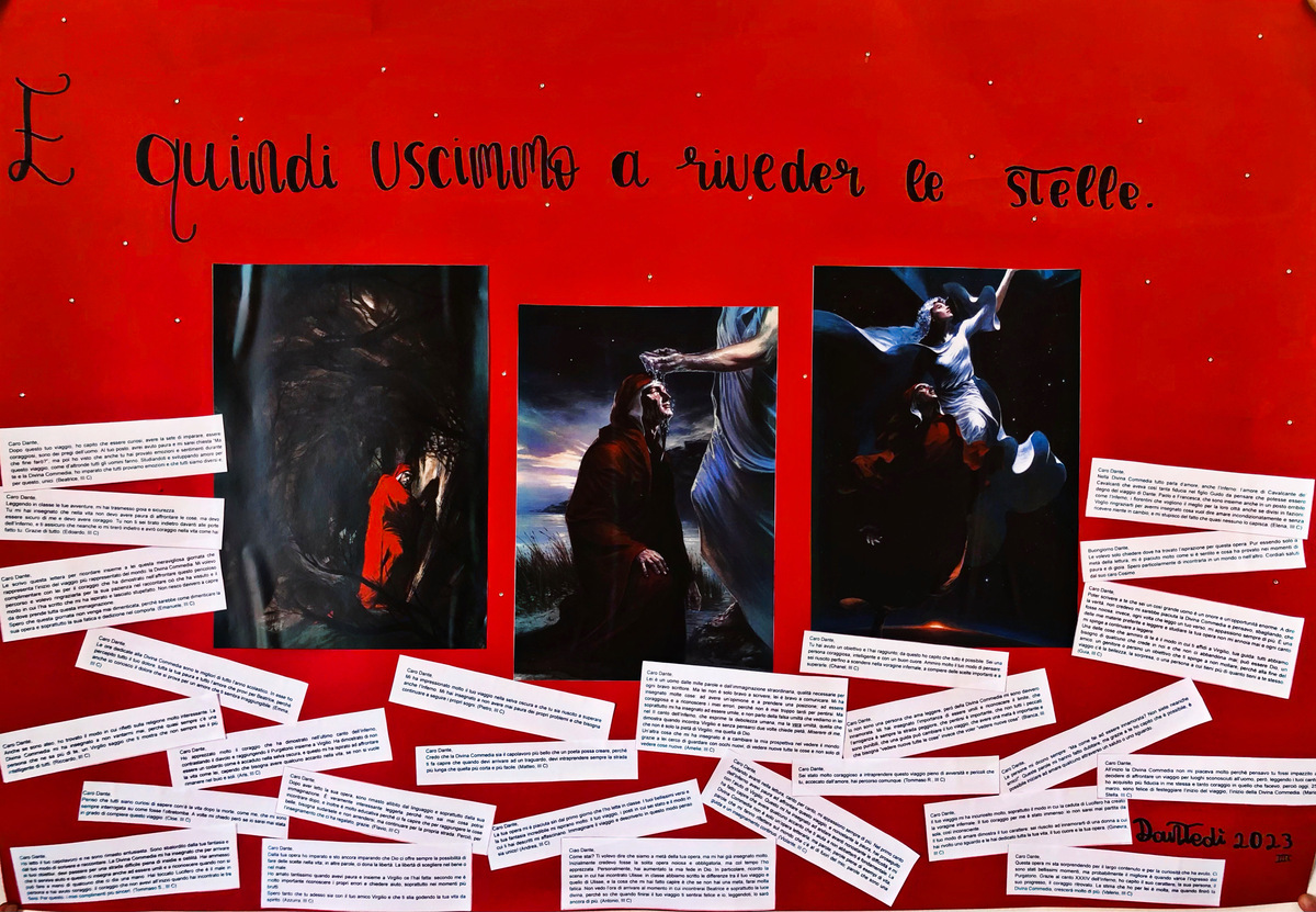 In occasione del Dantedì 2023 gli studenti della III C della scuola secondaria di I grado, guidati dalla Professoressa di Italiano e Latino Francesca Lamberti e facendo seguito al lavoro svolto in classe sulla Divina Commedia, hanno realizzato un cartellone con pensieri rivolti al sommo poeta.